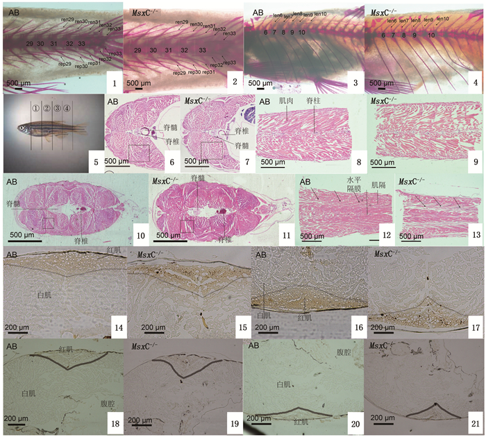 肌间刺形成有一定的相关性。为了进一步探究MsxC基因在肌间刺形成中的作用, 利用CRISPR/Cas9基因编辑技术, 建立斑马鱼MsxC基因纯合突变体(MsxC-/-)。结果表明: 与野生型斑马鱼相比, MsxC-/-斑马鱼尾部的髓弓小骨和脉弓小骨平均缩短15%以上, 差异极显著, 而躯干部的肌间刺长度则无明显差异; MsxC-/-斑马鱼大侧肌肌隔周围白肌细胞分布疏松, 且排列混乱, 越靠近尾部差异越明显; MsxC-/-突变体红肌面积增大, 越靠近尾部, 红肌面积增大越明显, 尾部红肌面积增大2.22%(P < 0.01), 而躯干靠前部位面积增大0.97%(P < 0.05)。这表明, MsxC基因的缺失既影响了肌间刺的形成, 同时也影响了大侧肌的发育。肌间刺又称肌间小骨、肌间骨,位于肌间隔中,由肌隔结缔组织骨化而成[1]。肌间刺仅存在于真骨鱼类中,尤其是低等真骨鱼类较为普遍存在肌间刺,如日本鳗鲡(Anguilla japonica)[2]、鲢(Hypophthalmichthys molitrix)[3]、鳙(Aristichthys nobilis)[4]、团头鲂(Megalobrama amblycephala)[5]、斑马鱼(Danio rerio)[6]等。肌间刺形成发生在鱼类胚后发育阶段,如斑马鱼、瓯江彩鲤(Cyprinus carpio)的肌间刺骨化时间在受精后32~53 d(days post fertilization, dpf)[6-7],鲢肌间刺骨化时间在43~55 dpf [3],唇