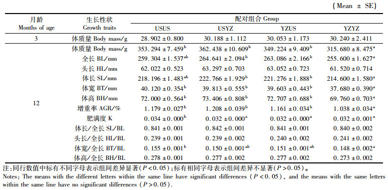 2 结果 2.1 生长性状的比较分析3月龄(从繁苗到标记)和12月龄,4个交配组合的子代生长数据见表 1。从表 1可见4个组合3月龄的生长性状差异不显著(P>0.05)。继续养殖275 d后,USYZ子代的平均体质量比USUS子代的平均体质量高2.59%,比YZYZ子代的平均体质量高14.81%,比YZUS子代的平均体质量高3.79%。