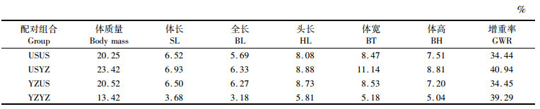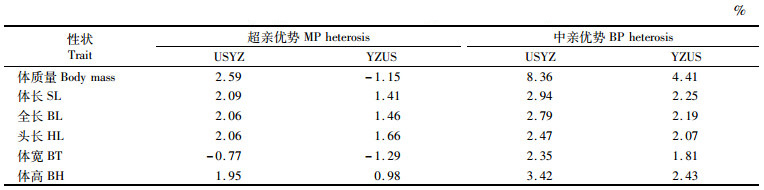 由表 3可见,2个杂交组合子代在各生长性状上均具有中亲优势(1.81%~8.36%), 其中: USYZ组合的子代在体质量、全长、体长、头长和体高上呈现超亲优势(1.95%~2.59%),YZUS组合的子代在全长、体长、头长和体高上呈现超亲优势(0.98%~1.66%);USYZ组合子代在各生长性能方面表现优于YZUS组合。