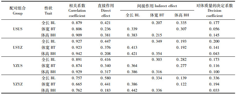 通径分析结果(表 4)显示,全长、体宽、体高对体质量的相关性均达到了显著性水平的正相关(P<0.05), 其中,全长对体质量的直接作用均大于其通过体高产生的间接作用,而体高对体质量的直接作用均小于其通过全长产生的间接作用,除YZYZ组合外,其余3个组合的体宽对体质量的直接作用均小于通过全长产生的间接作用。