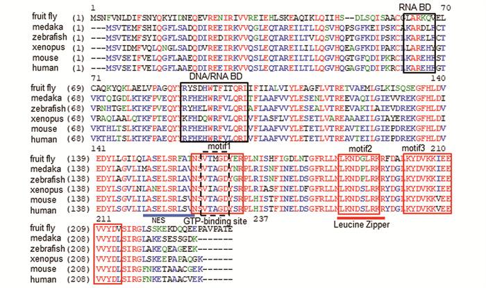 结构域RNA结合位点和DNA结合位点用黑色框标出;基序1,基序2和基序3用红色框标出;GTP结合位点用黑色虚线框标出;核输出信号用蓝色下划线标出;亮氨酸拉链结构用红色下划线标出。 RNA BD (RNA-binding site), DNA/RNA BD (DNA/RNA-binding site) are boxed in black; motif1, motif2, motif3 are boxed in red; GTP-binding site are boxed with dotted lines in black; NES (nuclear export-signal) (blue underlined); Leucine Zipper (red underlined). 图 1 青鳉与哺乳动物(人、鼠)、两栖类(爪蟾)以及无脊椎动物(果蝇)的氨基酸序列比对 Fig. 1 Amino acid alignment of the domains of mammal (human, mouse), amphibian(xenopus), fish (medaka, zebrafish) and invertebrate (fruit fly) |