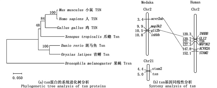利用MEGA 7.0软件,选用参数邻接法以果蝇Trsn为外类群,对鱼类、两栖类、鸟类和哺乳类多物种的tsn进行系统发育树分析。结果显示:青鳉和斑马鱼等鱼类聚在硬骨鱼分支上,而哺乳类、鸟类和两栖类聚在另一个大的分支(图 2a)上。根据基因同线性(synteny)分析发现,tsn位于青鳉21号染色体,同人2号染色体的TSN相对应。人TSN附近的STAM2也在青鳉tsn附近能找到,但是INHBB和GLI2等紧密连锁基因却独立于青鳉tsn,在青鳉2号染色体上。值得注意的是,人TSN的连锁基因INHBB、GLI2、MAP3K2、ACVR2A与青鳉tsn连锁基因acvr2ab、map3k2、gli2b、inhbb在染色体上的排列方向正好相反。这些结果表明,青鳉2号染色体和人2号染色体的这一区域可能起源于一个共同祖先,并且在向高等哺乳动物的进化过程中发生了反转及TSN、STAM2等片段的插入。GLI2、INHBB和MAP3K2、ACVR2A都是生殖细胞发生发育重要关联因子[14-15],TSN的插入可能改变这些基因在生殖细胞性分化和发育过程的表达,影响其生理功能的发挥(图 2b)。