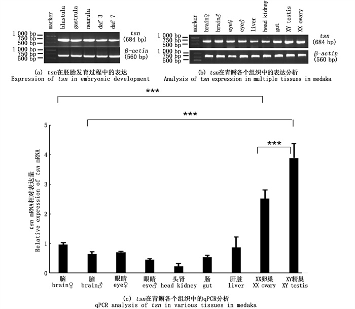 通过RT-PCR分析tsn mRNA在胚胎多个时期的表达,发现tsn mRNA在囊胚期、原肠胚期、神经胚期、受精后3 d(St.29:34体节期,dmy未表达)、受精后7 d(St.37:心包腔形成期,dmy表达)均有表达(图 3a)。同时,利用RT-PCR分析tsn mRNA在青鳉多个组织中的表达,结果显示, tsn mRNA在脑、眼睛、肝脏、头肾、肠、精巢、卵巢中广泛表达(图 3b)。以脑、眼睛、肝脏、头肾、肠、精巢、卵巢的cDNA为模板,对tsn mRNA在多个组织中的表达进行相对定量分析,发现tsn mRNA在精巢中表达量最高,并且tsn mRNA在精巢中的表达量极显著高于雄性脑及卵巢。此外,该结果也显示在卵巢中的表达量极显著高于雌性脑(P < 0.001),见图 3c。
