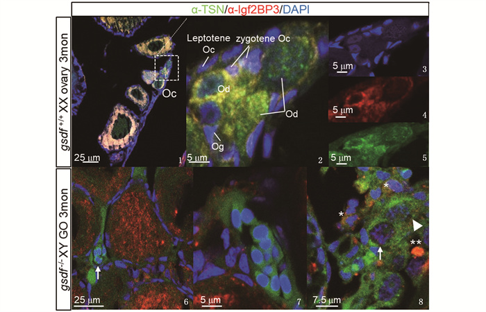 gsdf-/-XY型卵巢囊性生殖细胞的细胞质含有大量的抗Tsn(绿色)信号(图版-6白色箭头所示,7),即使这些生殖细胞进入减数分裂,Tsn信号也大多停留在细胞质中(图版-8白色箭头所示),少有进入细胞核(图版-8三角箭头所示);Igf2BP3在卵母细胞中大量表达(图版-6),同时还有一些Tsn和Igf2BP3共表达的初级卵母细胞(图版-8中*)以及抗Igf2BP3深染的死细胞残骸(图版-8中**)。