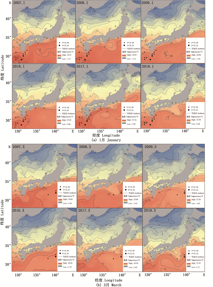 1—2月代表黑潮主轴及其分支; 3月份黑潮前锋。 January to February represents the main axis of Kuroshio and its branches; Kuroshio forward in March. 图 2 产卵期SST与太平洋褶柔鱼冬生群资源丰度显著相关的海区 Fig. 2 Areas with significant correlation between SST of spawning ground and CPUE of winter cohort of T. pacificus |