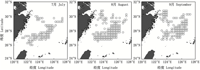 1.2 研究方法中国东海鲐鱼渔场主要分布在东海南部和北部2个海域, 南部渔场主要分布于东海海域, 捕捞旺季为7—9月; 北部渔场主要分布于黄海海域, 捕捞旺季集中在10—12月[12]。针对东海海域鲐鱼渔场时空变动进行研究, 筛选出7—9月的渔获数据进行分析。定义经纬度0.5°×0.5°为一个渔区, 计算作业时间内7—9月每个渔区内的单位捕捞努力量渔获量(catch per unit effort, CPUE)[13]。计算CPUE的公式为[14]