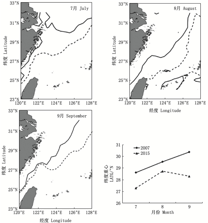如图 10所示, 2007年7—9月的渔场纬度重心主要为28.6°N~30.3°N, 且逐渐向北偏移; 而2015年渔场重心主要为27.3°N~28.3°N, 相对2007年而言向南偏移。2007年各月份的最适宜等温线比2015年的要更偏北, 导致2007年的渔场纬度重心也比2015年偏北。