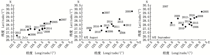 图 2 2005—2016年7—9月鲐鱼渔场重心的时空变化 Fig. 2 Spatio-temporal variations of the gravity centers of fishing ground for S. japonicus from July to September during 2005-2016 |