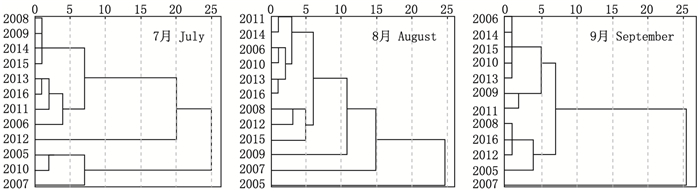 使用SPSS 26.0软件对2005—2016年7—9月的鲐鱼渔场重心进行聚类分析, 运用“组间联接”的方法, 计算不同年份之间的平方欧式距离[15]。聚类分析得出4类, 绘制每月的聚类树状图, 分析同一月份、不同年份之间渔场重心的变化情况, 依据聚类分析结果筛选发生异常气候事件的代表年份, 对比渔场的海表面温度与渔场重心的时空变化情况[15]。