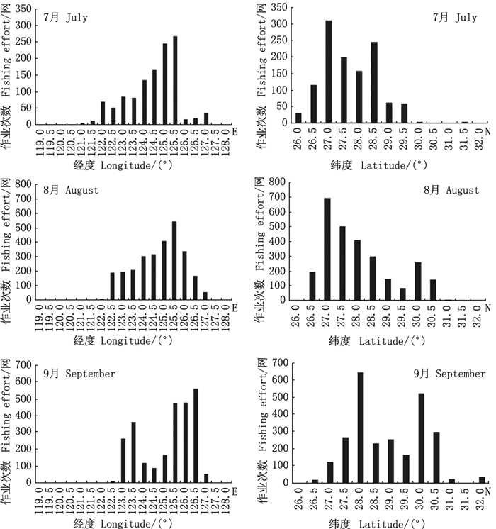 由图 4可知, 东海鲐鱼作业次数在经、纬度上的分布情况有明显的月间变化。7月, 鲐鱼的主要捕捞作业区域为122.0°E~125.5°E和26.5°N~28.5°N; 8月主要作业区域为122.5°E~126.5°E和26.5°N~30.5°N; 而9月渔场主要分布在123.0°E~126.5°E和27.0°N~30.5°N海域内。