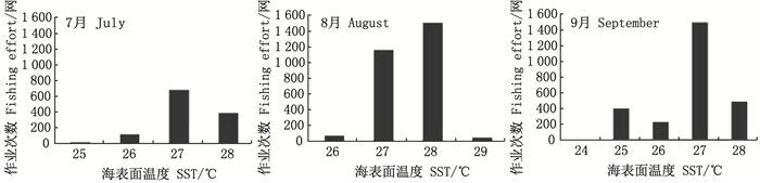 鲐鱼7—9月作业次数在SST上的分布同样具有显著的月间差异(图 5)。7月鲐鱼分布的SST范围为26~28℃, 最适宜SST为27℃; 8月SST分布范围为27~28℃, 最适宜SST为28 ℃; 9月主要集中在SST为25~28℃的海域内, 最适宜SST为27℃。