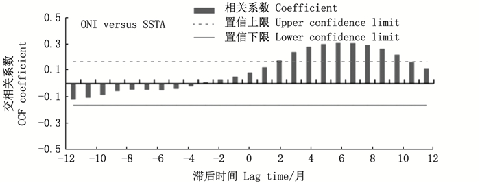 根据图 6相关结果可以看出鲐鱼渔场内的SSTA与ONI呈现显著的正相关关系(P < 0.05), 且SSTA与ONI在滞后6月时的正相关性最大, 对应的相关系数为0.311。