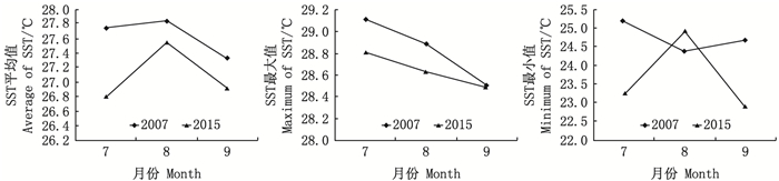 图 7 2007和2015年7—9月SST的平均值、最大值和最小值 Fig. 7 Average SST, maximum SST and minimum SST from July to September in 2007 and 2015 |