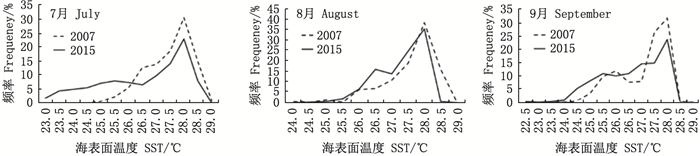 2007和2015年各月SST频率分布具有明显的差异(图 8)。总体来看, 2007年SST要高于2005年。7月, 2007和2015年SST高频率分布范围分别为26.5~28.0℃和25.5~28.0℃; 2007年8月SST高频率分布范围为27.5~28.0℃, 而2015年8月SST高频率分布范围为26.5~28.0 ℃; 9月, 2007和2015年的SST高频率分布范围分别为26.0~28.0℃和25.5~28.0℃。