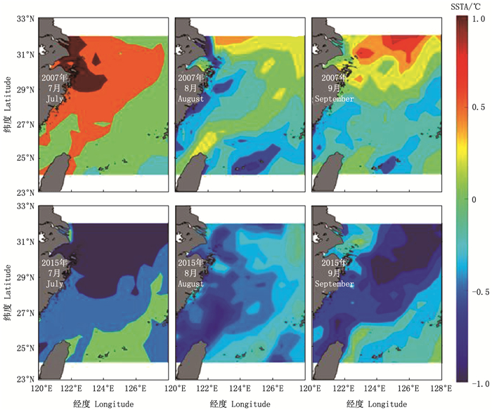 由图 9可以看出, 研究海域内2007和2015年的SSTA变化非常明显。2007年发生拉尼娜事件, 渔场内SSTA较高, 且增温的分布范围较大; 而2015年各月SSTA主要呈现为负值, 且广泛分布在鲐鱼渔场范围内。