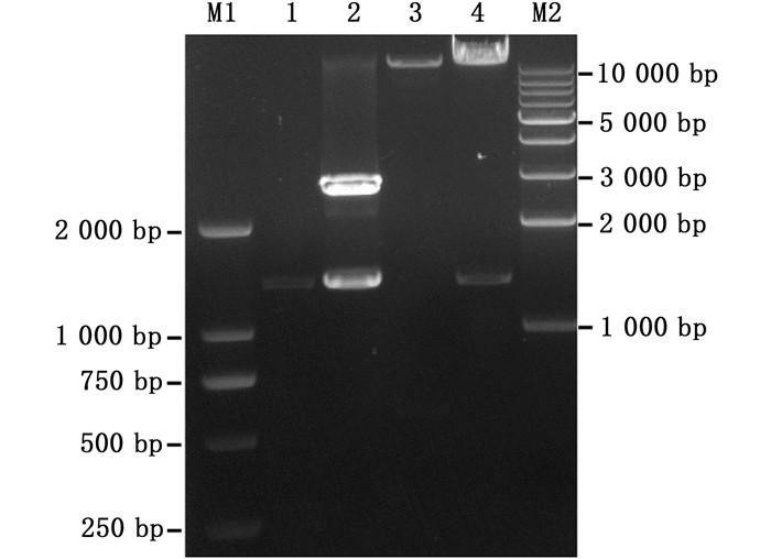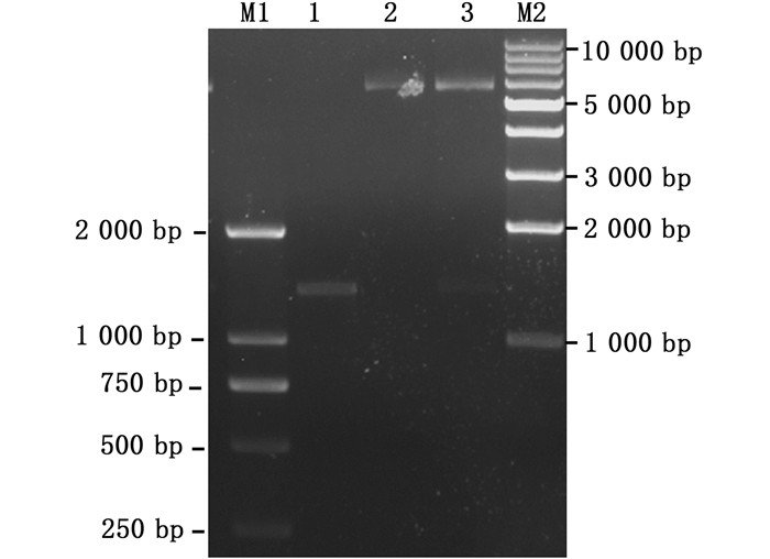 2 结果 2.1 双元表达载体pC-Δ15 FAD的构建使用TRIzol试剂法抽提缺刻缘绿藻总RNA,然后利用RT-PCR试剂盒合成cDNA第一链。根据缺刻缘绿藻Δ15 FAD基因的开放阅读框(ORF)序列(GenBank登录号:EU658930)以及载体pMD19-T和pCAMBIA1300的多克隆位点序列,设计1对携带限制性内切酶Eco R Ⅰ和Xba Ⅰ识别位点的特异性引物Δ15 FAD -F和Δ15 FAD -R,以合成的cDNA第一链为模板进行PCR反应。扩增产物(图 1泳道1)被连接至克隆质粒pMD19-T上以构建pMD19T-Δ15 FAD。经序列分析可知目的基因的大小为1 311 bp,除了限制性内切酶识别位点的序列外,其余序列与在GenBank中注册的该基因ORF序列完全一致。
