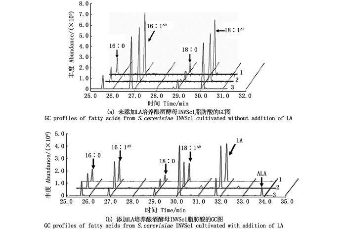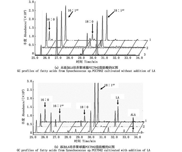 聚球藻PCC7942[23-25]和酿酒酵母[26-27]细胞的脂肪酸组成简单,这些脂肪酸主要包含棕榈酸(16∶ 0)、棕榈油酸(palmitoleic acid,16∶ 1Δ9)、硬脂酸(18∶ 0)和油酸(oleic acid,18∶ 1Δ9)。聚球藻PCC7942和酿酒酵母只含有单不饱和脂肪酸,因为它们均只有1个Δ9 FAD,尽管聚球藻的Δ9 FAD是在酰基酯sn-1和sn-2位上的脂肪酸经过脱氢反应引入第1个双键[1],而酿酒酵母的却和结合于CoA上的脂肪酸发生相同的作用[27-28]。本研究从非转基因的聚球藻PCC7942和酿酒酵母中也只检测到这4种主要脂肪酸(图 3、图 4、表 1),说明本研究的脂肪酸检测结果是可信的。在检测聚球藻的脂肪酸组成时,保留时间29 ~30 min,发现了3个小峰(图 3a),但经质谱分析,发现它们都是一些芳香族非脂肪酸的杂质峰;同样的情况也出现在添加外源LA培养的转基因聚球藻中(图 3b),但杂质峰的保留时间不同。