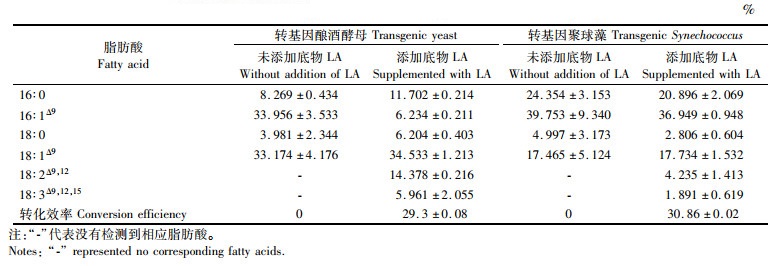 表 1 转基因酵母和转基因聚球藻在添加外源LA培养后脂肪酸的组分 Tab.1 Fatty acid compositions of the transgenic Synechococcus and yeast under the culture supplemented with exogenous linoleic acid (LA) |