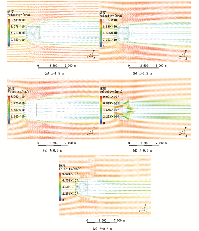 2.3 不同沉降程度对单体方型多孔人工鱼礁水平方向流态影响为了研究空心多孔方型人工鱼礁水平方向的内部及外部流态情况,选择不同沉降程度下裸露礁体高度的一半位置作为横切面进行后处理[17]。设横截面高度为H,5种不同沉降程度下对应的横截面高度H分别为1.5 m、1.2 m、0.9 m、0.6 m、0.3 m,各平面上的速度矢量分布见图 8。从图 8可以看出,当水流经过礁体时,由于礁体壁面的阻碍作用,水体流向向两侧偏转形成侧向流,同时流速有不同程度的增加,流速最大值出现的位置在X轴方向均处于礁体中心,整体呈两侧对称分布。在沉降深度为0 m、0.6 m、1.2 m时,最大值流域距礁体侧面距离约为1 m,并且通过图 8可以明显看出,在沉降深度为0.6 m时,礁体两侧流速增大区域范围明显增大,约为无沉降状态时1.5倍。从沉降程度60%开始,礁体流速增加区域明显靠近礁体两侧,且整体流速接近来流速度(0.8 m/s),在沉降深度达到80%时,礁体两侧流速增大区域基本消失,平均流速与来流速度基本相同。