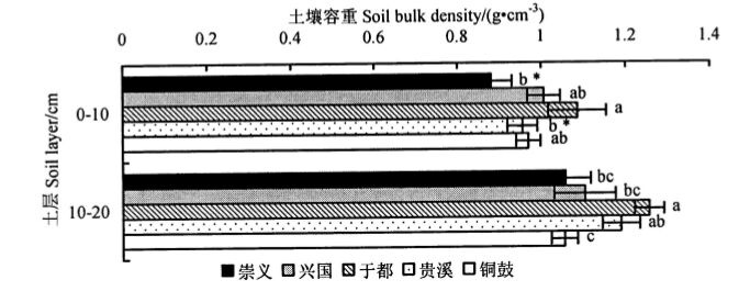 3.1.1 土壤容重容重对土壤透气、入渗、持水、溶质迁移及土壤抗侵蚀能力有很大影响[28]。不同分布区和不同土层毛竹林土壤容重均存在显著差异(表3和图1)。不同分布区毛竹林0-10 cm和10-20 cm土层土壤容重分别介于0.88-1.09 g·cm-3和1.05-1.26 g·cm-3,于都毛竹林地最高,崇义毛竹林地较低。土壤容重随着土层的增加均呈降低趋势,崇义和贵溪毛竹林土壤容重在土层间差异显著。