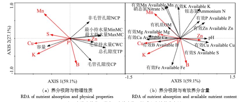RDA结果表明土壤理化性质对不同养分元素吸附特性的影响不同(图2)。土壤物理性质与养分吸附特性的RDA结果[图2(a)]中轴一较多的反映了容重和土壤持水性能的影响,轴二更多的反映土壤孔隙状况的影响。S、Cu和K的吸附率与容重呈正相关,与土壤持水性能和孔隙状况呈负相关;Zn与之相反;Mn和B与容重的相关性较弱。土壤养分性质与养分吸附特性的RDA结果[图2(b)]中轴一较多的反映了在不同分布区高于和低于养分临界值的养分元素(Zn、Cu、Ca和Mg等)和pH的影响,轴二更多的反映NPK和其它一些养分元素的影响。在元素养分吸附率与其养分含量的相关性中,只有Mn和Zn吸附率分别与其养分含量呈正相关,S和Cu吸附率分别与其养分含量呈负相关,而P、K和B吸附率分别与其养分含量相关性不明显。