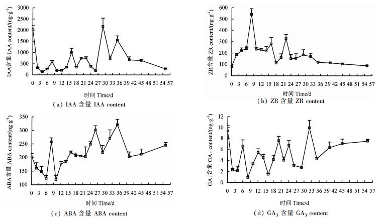 1.2 方法称取0.5 g材料,加2 mL样品提取液[80%甲醇,内含1 mmol·L-1丁羟甲苯(butylated hydroxytoluene, BHT),冰浴中研磨成匀浆,转入10 mL试管,再用2 mL提取液分次将研钵冲洗干净,一并移入试管中,摇匀,放置4 ℃冰箱中;4 ℃中浸提4 h;3 500 r·min-1,离心8 min,取上清液。在沉淀物里加1 mL提取液,搅匀,4 ℃中提取1 h,3 500 r·min-1,离心8 min,合并上清液,记录体积,弃残渣。上清液过C18固相萃取柱进行纯化后待测。采用酶联免疫吸附测定法(enzyme-linked immunosorbent assay, ELISA)[18]测定激素含量,试剂盒由中国农业大学提供。每个样品重复测定3次。