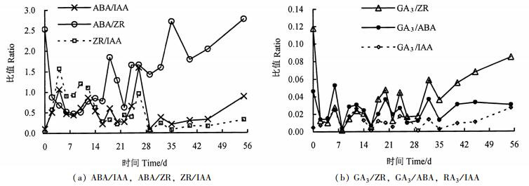 油茶芽苗砧嫁接口的ABA/IAA、ABA/ZR、ZR/IAA、GA3/ZR、GA3/ABA和GA3/IAA的比值在愈合过程中都随着发育时间而波动。按其比值的最大值与最小值的倍数大小排列,分别为GA3/ZR,值为69.71;ZR/IAA,40.27;GA3/IAA,21.50;ABA/IAA,16.10;GA3/ABA,14.91;ABA/ZR,5.83。从绝对数值上看,ABA/IAA、ABA/ZR和ZR/IAA三者比值较大,最大值达2.71;GA3/ZR、GA3/ABA和GA3/IAA这三者的比值则较小,几乎在0.1以内波动。ABA/IAA和ZR/IAA的比值变化比较相似,在处理后的第4、12、26和32天都有峰值;在处理后的第8、16、29和35天都有谷值。GA3/ZR、GA3/ABA和GA3/IAA的比值变化也相似,在处理后的第6、12、24和32天有峰值;在处理后的第8、16、22、29和35天都有谷值。而ABA/ZR的比值是先下降后曲折上升,在嫁接后的第8、18、22、29、35和40天有捌点。