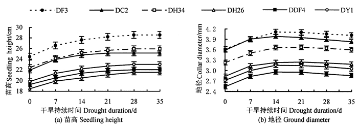 2 结果与分析 2.1 持续干旱对不同家系马尾松苗木生长指标的影响持续干旱胁迫下, 不同家系马尾松苗木苗高、地径变化如图 1所示。随干旱加剧, 6个家系马尾松苗木苗高、地径生长均变缓, 直至停止。从图 1 (a)可知, DC2家系苗高在干旱前期生长最快, 但随干旱时间延长, 最先呈生长缓慢及停止生长的现象。处理结束时, DF3家系苗高增幅与DDF4、DC2、DH26、DY1家系差异显著(P < 0.05), DH34与DDF4差异显著(P < 0.05), 其中, DF3和DH34家系苗高增幅最大, 分别为4.06和3.50 cm, DDF4家系增幅最小, 为2.73 cm, DC2、DH26、DY1家系苗高增幅无显著差异, 分别为3.18、3.04、3.17 cm。从图 1(b)可知, 在干旱0~14 d, DC2, DF3家系地径生长量与其它4个家系差异显著(P < 0.05);干旱14 d后, DC2家系地径生长先受到抑制, 地径生长量明显下降, 其它5个家系在干旱21 d后地径生长量才明显下降; 第35天, DF3家系地径增长量最大, 为0.40 mm, DC2家系最小, 为0.25 mm。各家系地径总增长量比较小, 可能是因为在干旱胁迫后期, 苗木失水严重, 地径生长量的积累受到严重抑制。