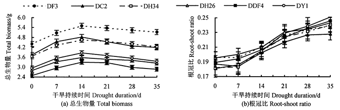 持续干旱胁迫下不同家系马尾松苗木总生物量、根冠比的变化如图 2所示, 在不同程度干旱胁迫下, 各家系根冠比和DDF4、DY1家系总生物量积累存在显著差异(P < 0.05)。由图 2 (a)可知, 随干旱加剧, 6个家系马尾松苗木总生物量积累均呈先升后降趋势, 这可能是因为在干旱前期至中期, 苗木生长受抑制较小, 生物量合成大于消耗, 有一定的积累, 而在干旱后期, 生长受抑制, 生物量消耗大于合成, 造成生物量减少。由图 2(b)可知, 根冠比在干旱前期变化不明显, 在干旱中期至后期, 根冠比随干旱加剧不断增大, 表明在此时期干旱胁迫抑制苗木地上部分生长比地下部分更显著。胁迫结束后, DF3家系最终干物质积累量最大, 达0.72 g, 与DC2、DH26、DY1和DDF4家系存在显著差异(P < 0.05), DDF4家系最小, 为0.39 g, DH34家系最终干物质积累量与DY1和DDF4家系存在显著差异(P < 0.05)。