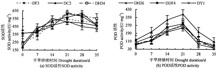 持续干旱胁迫下不同家系马尾松苗木SOD、POD活性如图 3所示, 6个家系SOD、POD活性均随干旱胁迫加剧呈先升后降趋势。0~7 d, 保护酶系统开始响应, DC2、DH34、DY1家系SOD活性上升较大; 7~14 d, DH26家系SOD活性上升较快, 与DDF4、DY1家系差异显著(P < 0.05);第21天, DF3、DH34、DDF4、DY1家系SOD活性上升到最大值; 第28天, DY1家系SOD活性与DC2、DDF4、DH34这3个家系差异均显著(P < 0.05);28~35 d, 6个家系SOD活性均下降, 其中DC2家系下降幅度最大; 第35天, DY1家系SOD活性与DC2、DDF4、DH34这3个家系差异显著(P < 0.05), DY1家系活性保持最低, DH34家系活性最高。第7天, DC2与DH26家系的POD活性差异极显著(P < 0.01), 与DF3、DH34、DDF4家系的POD活性差异显著(P < 0.05);14~21 d, 各家系POD活性升到最大, 第14、21天, DC2与DH26家系的POD活性差异极显著(P < 0.01), 与DF3、DH34、DY1家系的POD活性差异显著(P < 0.05), DF3和DC2家系POD活性仍较高, 与其余家系差异极显著(P < 0.01);第35天, DC2家系POD活性与DF3家系差异显著(P < 0.05), 与其余家系差异极显著(P < 0.01), 此时, DC2家系POD活性增幅最大, 为279.05 U·mg-1, DF3家系最小, 为194.94 U·mg-1。总体看, 随干旱加剧, 各家系通过提高SOD、POD活性来清除植物体产生的自由基, 以适应干旱环境。
