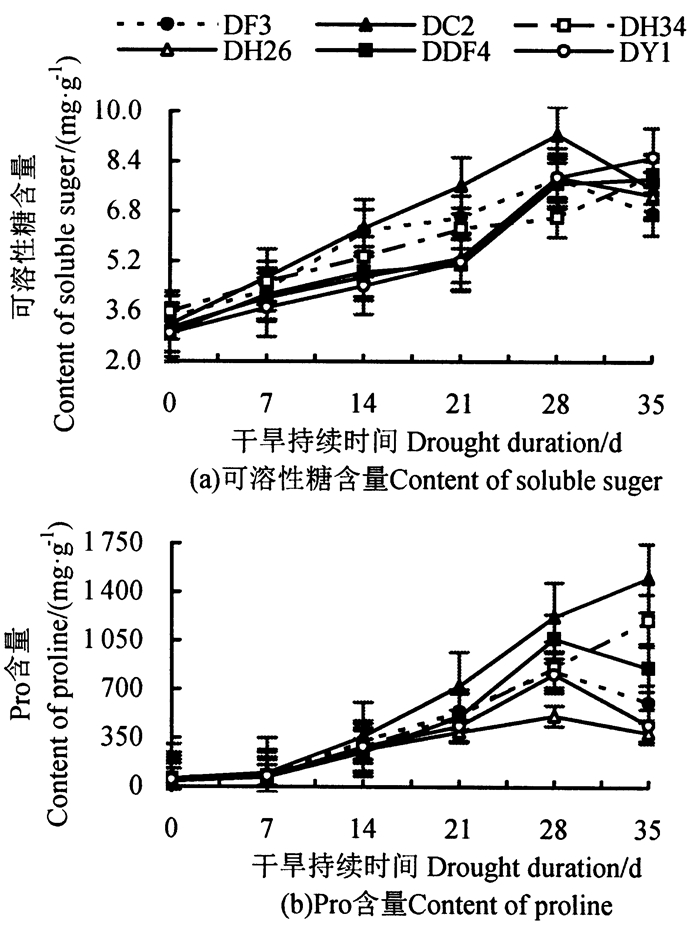 持续干旱胁迫下不同家系马尾松苗木可溶性糖和Pro含量的变化如图 4所示。从图 4可知, 随干旱加剧, DH34、DDF4、DY1家系可溶性糖含量持续上升, DF3、DC2、DH26家系先升后降, DC2和DH34家系Pro含量在整个干旱过程中持续上升, 其余家系先升后降, 6个家系可溶性糖、Pro含量在不同干旱胁迫下存在极显著差异(P < 0.01)。由图 4 (a)可知, 7~14 d, DF3家系可溶性糖含量开始显著上升, DF3、DC2与DH26、DDF4、DY1家系均存在极差异显著(P < 0.01), 7~28 d, DC2家系对干旱响应迅速, 可溶性糖含量上升显著, 均保持最高; 28~35 d, DH34家系上升最快, 在极重度干旱后期大量增加来抵御干旱胁迫的伤害, DC2家系大幅下降, 这可能是因为此时干旱胁迫对其产生很严重的伤害。处理结束时, DC2家系可溶性糖含量增幅最大, 为6.08 mg·g-1, DH34家系最小, 为4.34 mg·g-1。由图 4(b)可知, 0~14 d, 各家系Pro含量上升不大, 差异不显著; 14~21 d, DC2家系上升最明显, 第21天, DC2与DH34、DH26、DY1家系差异极显著(P < 0.01), 且21 d后DC2家系Pro含量比其它家系大; 第28天, DF3、DH26、DDF4、DY1家系Pro含量达到最大, 之后呈下降趋势; 第35天, DC2和DH34家系Pro含量达到最大, 此时, DC2家系Pro含量上升最大(25.27倍), 这可能是因为干旱胁迫对DC2家系伤害最大, 从而产生更多的Pro。