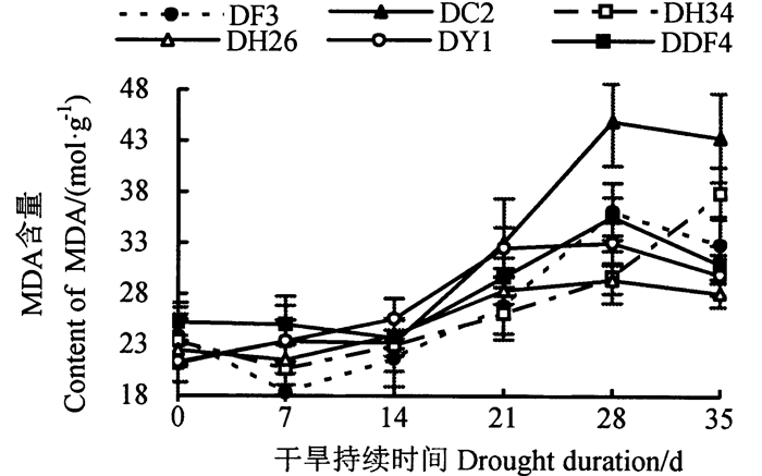 持续干旱胁迫下不同家系马尾松苗木MDA含量的变化情况如图 5所示, 6个家系均发生膜脂过氧化, 各家系MDA含量均上升。0~14 d, 各家系MDA含量变化较小, 表明此时期膜系统未受到损伤; 14~28 d, 各家系MDA含量均升高, 出现膜脂过氧化, DF3、DC2、DH26、DDF4、DY1家系上升到最大, 第28天, DC2家系与其余家系差异均极显著(P < 0.01);28~35 d, DH34家系MDA含量上升到最大, 与DF3、DH26、DDF4、DY1家系差异达极显著水平(P < 0.01), 第35天, DC2家系与DF3、DDF4、DY1家系差异极显著(P < 0.01), 与DH34家系差异显著(P < 0.05)。处理结束时, DC2家系MDA含量增幅最大, 为23.72 mol·g-1, DH26家系最小, 为6.94 mol·g-1。