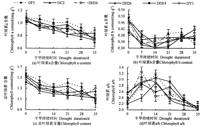 持续干旱胁迫下不同家系马尾松苗木叶绿素a、叶绿素b、总叶绿素含量和叶绿素a/b值的变化如图 6所示, 随干旱加剧, 各家系叶绿素a、叶绿素b、总叶绿素含量和叶绿素a/b值均下降, 在不同干旱胁迫下存在显著差异(P < 0.05)。DF3、DC2和DH26家系叶绿素a随干旱加剧呈先降后升又降的趋势, DH34家系从第7天后呈先降后升又降又升的趋势, DDF4、DY1家系一直呈下降趋势, 其中, DF3家系降幅最大, 达36.00%, DH34家系最小, 为16.09%。DF3、DDF4家系叶绿素b呈先降后升又降的趋势, DH26、DY1、DC2、DH34家系呈先降后升的趋势, 其中, DF3家系降幅最大, 为32.87%, DH34家系最小, 为8.04%。各家系总绿素的变化趋势与叶绿素a变化趋势一致, 叶绿素a/b值呈先升后降趋势, DC2、DH34、DY1家系在第7天上升到最大, DF3、DH26、DDF4家系在第14天升到最大, 整个干旱过程中, DDF4家系叶绿素a/b值降幅最大, 为19.92%, DH26家系最小, 为3.78%。