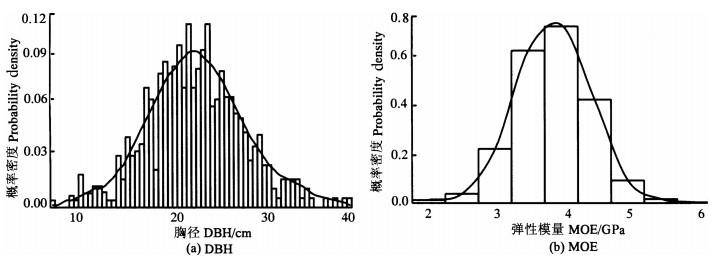 图 1 胸径和弹性模量的概率分布 Fig. 1 Probability distribution histogram for DBH and MOE |