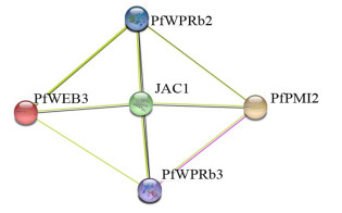 为了解WPR基因家族成员在泡桐丛枝病中发挥的作用,对其构建蛋白互作网络(图 9),发现在白花泡桐丛枝病病苗中PfWEB3、PfWPRb2、PfWPRb3和PfPMI2均与一种能导致叶片黄化的叶绿体运动相关的蛋白JAC1互作,推测其与JAC1具有相似功能。
