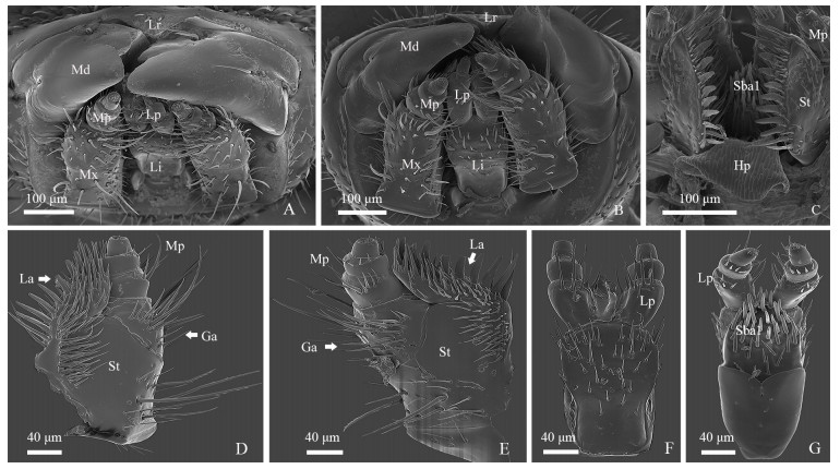 注:A. 雄虫; B. 雌虫; C. 口器整体的面内侧面; D. 下颚内侧面(右); E. 下颚内侧面(左); F. 下唇内侧面; G. 下唇外侧面; Lr. 上唇; Md. 上颚; Mx. 下颚; Li. 下唇; Mp. 下颚须; Lp. 下唇须; Ga. 外颚叶; La. 内颚叶; St. 胫节; Hp. 舌; Sba1. 锥形感器1。 Note: A. male; B. female; C. internal view of a female mouthpart; D. internal view of right maxillae; E. external view of left maxillae; F. internal view of labium; G. external view of labium; Lr. labrum; Md. mandible; Mx. maxillae; Li. labium; Mp. maxillary palpus; Lp. labial palpus; Ga. galea; La. lacinea; St. stipes; Hp. hypopharynx; Sba1. sensilla basiconica 1. 图 2 短毛切梢小蠹雌雄成虫的口器 Fig. 2 Whole morphology of the mouthparts of adult Tomicus brevipilosus |