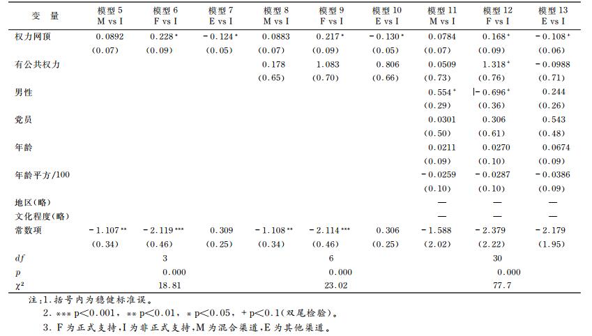 从模型6可以发现,在不加入控制变量的情况下,权力网顶的系数为0.228,而且在p < 0.05的水平显著。这表明相对于非正式渠道,社会网络中的权力资源越丰富的城镇居民,更倾向于选择正式渠道去解决纠纷。与此同时,在模型7中,权力网顶的系数为-0.124,这说明在面对非正式渠道和其他渠道时,权力资源丰富的城镇居民更可能选择非正式渠道。