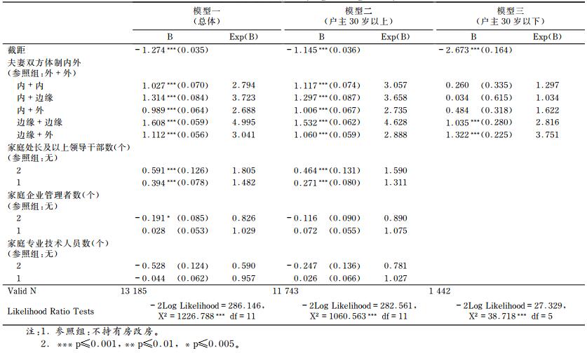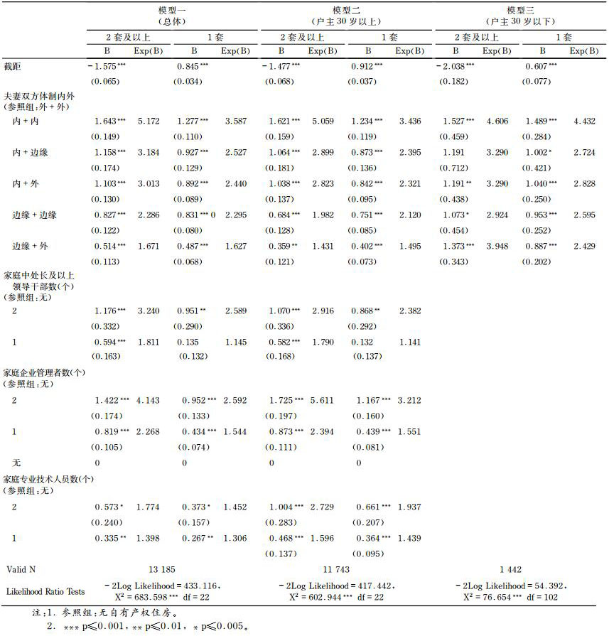 如前所述,城市家庭户所拥有的产权住房多数来自房改前的住房分配和房改过程,那么是谁在这样的过程中受益呢?表 2显示的是本文所谓的体制差异如何体现于人们的产权住房的拥有上。为了达到我们的分析目的,在统计分析过程中,我们以家庭为分析单位,以户主及其配偶所在单位的体制归属作为自变量(将工作单位为党政机关或事业单位者操作化为“体制内”,工作单位为国有企业者为“体制边缘”,工作单位为其他类型为“体制外”),分析人们住房拥有方面的体制差异。考虑到可比性,表 2仅对户主及其配偶均处于就业年龄阶段的家庭(退休、就学或其他情形则不予考虑),并且选择户主与其配偶信息都齐全的家庭户作为分析对象(户主及其配偶只要有一方信息缺失,该家庭样本就作缺省处理)。从表 2的分析结果来看,体制分割在人们产权住房的拥有上表现非常明显,例如,夫妻双方均在体制内就业者,拥有2套及以上产权住房的可能性是夫妻双方均在体制外就业者的5.172倍,拥有1套产权住房的可能性是后者的3.587倍。住房的这种体制分割差异在不同年龄组中也同样有所表现,只是在户主年龄为30岁以上的家庭组中表现得更为突出。需要指出的是,为了比较分析的需要,纳入表 2统计分析的家庭户只涉及夫妻双方健在并且都处在就业状态中(夫妻双方已退休的家庭样本,或者夫妻有一方退休的家庭样本未被纳入统计分析当中),因此,年龄因素,特别是工龄因素可能的影响并没有被充分考虑进来,否则这种体制差异会更加明显。表 2的各模型中,同时也考虑到了行政级别(操作化为家庭中处级及以上干部人数)等几个因素对人们产权住房拥有的影响,从中可见,能够体现体制差异的行政级别这一因素对人们产权住房拥有的影响同样是非常明显的。在表 2的模型一和模型二中,夫妻双方是否为企业管理人员、是否为专业技术人员也被纳入其中,这两个变量通常可以作为“市场能力”的度量。可见,“市场能力”对人们自有产权住房的拥有也有一定影响,但值得注意的是,这两种所谓的“市场能力”,特别是其中的“专业技术人员”与体制还有一定的关联,相对于体制外而言,体制内从业人员更加看重专业技术职称的评定,而我们的测量是以专业技术职称为参照的。