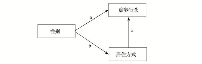 具体来说,笔者认为,在“从夫居”的文化背景下,子女性别对赡养行为的影响是通过两条途径实现的(见图 1)。第一条是直接效应(a),它表示,如果儿子和女儿与父母的居住方式完全相同,赡养行为是否存在显著的性别差异。从这个角度看,中国特殊的父系家庭制度规定儿子承担不可推卸的赡养责任,所以儿子的直接效应应该大于女儿。第二条是通过居住方式产生间接效应(b*c),它表示由于子女与父母的居住方式不同所导致的赡养行为上的差异。从这个角度看,中国家庭“从夫居”的传统导致父母通常选择与儿子同住,而与父母同住又会增加儿子在各个方面赡养父母的可能性,所以,儿子的间接效应也应大于女儿。性别的总效应则是直接效应和间接效应之和,即a+b*c。