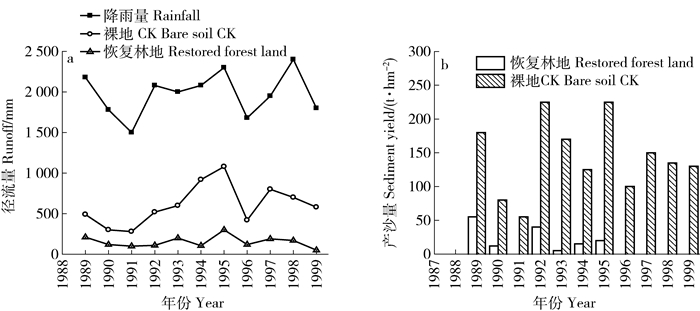 3 结果与分析 3.1 产流产沙特征对比红黏土侵蚀劣地集水区恢复6年(1993年)后植被覆盖度超过80%,形成乔灌草复合型冠层结构,由图 1(a)可以看出,1993年之后对照和植被恢复区的产流差距变大,植被恢复10年后恢复区的产流显著小于裸地对照,恢复8年后产沙得到控制,产沙量几乎为零(图 1(b)),长期降雨与产流产沙间呈现相同的变化趋势。