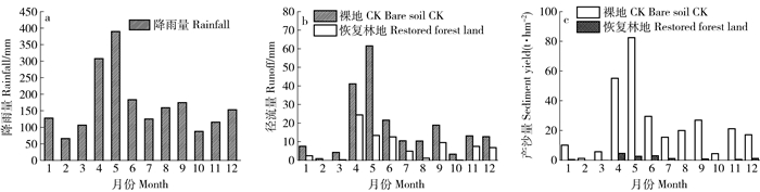 图 2 研究区年内降雨产流产沙特征 Figure 2 Characteristics of monthly rainfall (a) runoff (b) sediment yield (c) in the study area |