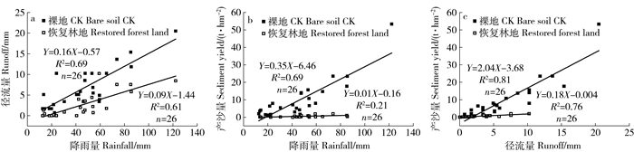 选取2个集水区均产流且降雨量大于10 mm的26次降雨分析降雨因子与产流产沙的关系。将最大时段侵蚀性降雨强度I60、降雨量、降雨历时与产流量、产沙量进行相关性分析,得出对照及恢复集水区产流产沙量均与降雨量相关性最好,且裸地对照降雨-产流、降雨-产沙关系曲线的斜率显著大于恢复林地,表明植被具有减小产流产沙增加趋势的作用(图 3(a)和(b)),恢复林地降雨-产沙关系曲线斜率近乎为零,表明恢复林地产沙量很小。分析原因是由于在降雨不断增加的过程中,植被有效拦截了一部分雨水,植物通过叶片降低雨滴动能,同时也降低对地表的溅蚀力,减少降雨侵蚀,植物的根系具有蓄水拦沙的作用,减少土壤的流失,这与以往学者在红壤区的研究结果[11-14]一致。南方红壤区雨季暴雨频发且降雨集中,因此,通过恢复措施可以有效控制水土流失。对裸地及恢复林地的产流量与产沙量进行统计分析发现:裸地对照及恢复林地的产流-产沙均呈显著的正相关关系,且对照区产流-产沙关系曲线斜率显著高于恢复区,表明裸地对照区与恢复林地产流量相同时,对照区比恢复林地产沙量大,表明植被恢复林地的保水保土效益显著(图 3(c))。
