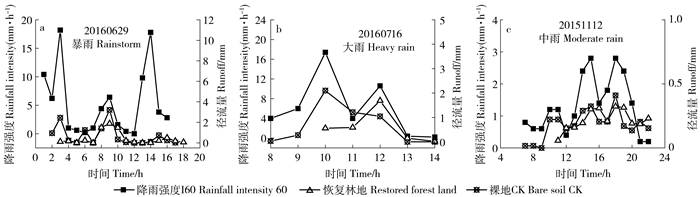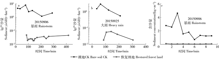 过程产流趋势与降雨强度I60变化趋势一致,总体上对照区产流时间早于恢复区1 h以上,2个集水区产流过程均呈多峰型(图 4)。产流滞后时间随雨强减小而增大,通常坡面产流在仅降雨变化的条件下,与降雨强度小的降雨相比,一般降雨强度高的降雨入渗至土壤的雨水相对较少,坡面更容易产生径流,故其产流滞后降雨的时间较短[15]。恢复林地次降雨减沙效益显著,达到91%~98%,恢复林地产沙延缓时间与产流一致(图 5(a)和(b))。次降雨过程泥沙含量表现为先增大后减小最后趋向稳定,恢复林地径流中含沙量很小,土壤侵蚀不明显(图 4(c))。
