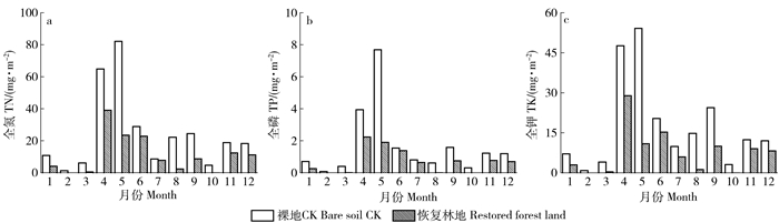 根据2015年8月至2016年7月对照区及恢复林地均产流且降雨量大于10 mm的26次降雨产流样品中养分含量均值及月产流量估算径流中月养分流失量及全年养分流失总量。恢复林地年内径流中全氮、全磷、全钾流失量较裸地对照分别减少54.62%、57.53%和56.46%,表明植被保持水土养分的效益显著。年内2个集水区径流中养分流失量均集中在雨季4—6月且裸地对照养分流失量显著高于恢复林地(图 6),养分流失量与降雨量、径流量呈现相同的变化趋势。对照区5月降雨量最大,养分流失量最多,而恢复林地径流中养分流失最多的是4月,年内变化趋势与降雨产流一致。