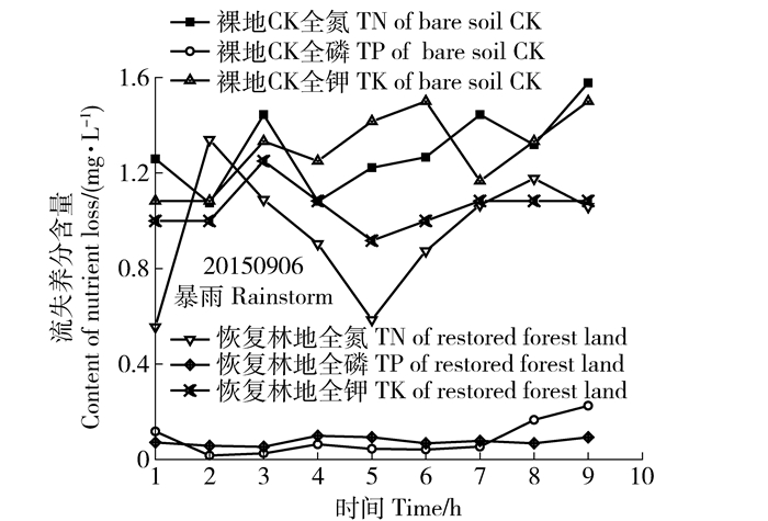 图 7 研究区次降雨过程养分流失含量变化 Figure 7 Characteristics content of nutrient loss in the runoff of a single rainfall event in the study area |