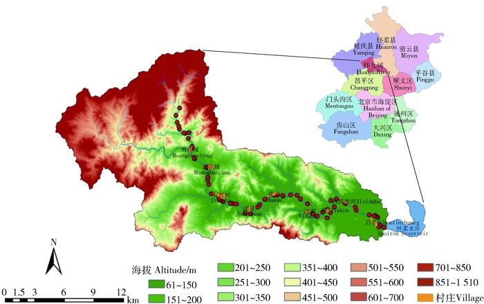1 研究区概况怀九河位于北京市山区怀柔西南部(E 116°19′54.3″~116°34′3.5″,N 40°18′59.5″~40°26′51.6″)(图 1),属海河流域潮白河水系,是北京山区的典型山溪性河流,也是怀柔水库重要的入库水源。其起点位于怀柔区鳞龙山自然风景区,路经二道关、黄花镇、团泉、一渡河和后辛庄,终点位于怀柔水库,总段长约37.4 km,总面积约347.2 km2。该地段属于北温带大陆性季风气候,冬夏温差较大,1月份平均气温-5 ℃,7月份平均气温25.3 ℃,年最高气温38 ℃,最低气温-18 ℃。