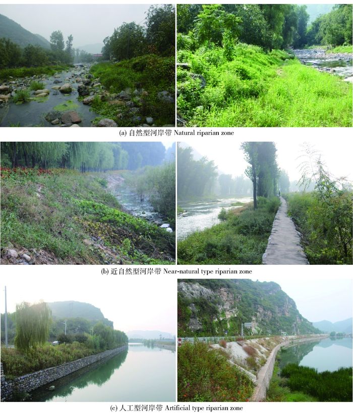 2 研究方法 2.1 样地设置2016年9—10月在北京怀柔区怀九河,沿河岸带开展植被和土壤的野外调查和取样工作。依据河岸带受干扰程度和发育状况,将其分为自然型河岸带、人工型河岸带和近自然型河岸带(图 2)。
