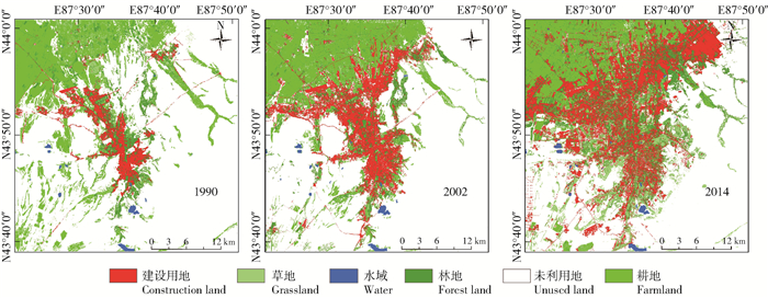 图 1 1990、2002、2014年乌鲁木齐市建成区景观类型分布图 Figure 1 Distribution map of landscape type in Urumqi city in 1990, 2002, and 2014 |