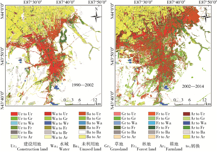 基于ArcGIS软件,获得乌鲁木齐市建成区1990—2002年与2002—2014年2个时段的景观类型转化图(图 2)。由图 2可知,近25年研究区景观类型的变化,主要体现在景观面积和各景观类型2者之间的相互转换上,并且有着较为显著的空间变化和在时间上的阶段性。在1990—2002年期间,乌鲁木齐建成区中的景观类型变化是以耕地、未利用地和建设用地的显著变化为主要来源。其中:土地利用类型中耕地面积的减少,主要分布在城市的边缘地带;建设用地的快速扩张,主要体现在对未利用地的开发和耕地的占用。而在2002—2014年期间,各景观类型变化主要来源于城市中耕地、建设用地和未利用地三者之间的相互转换和增减状况。