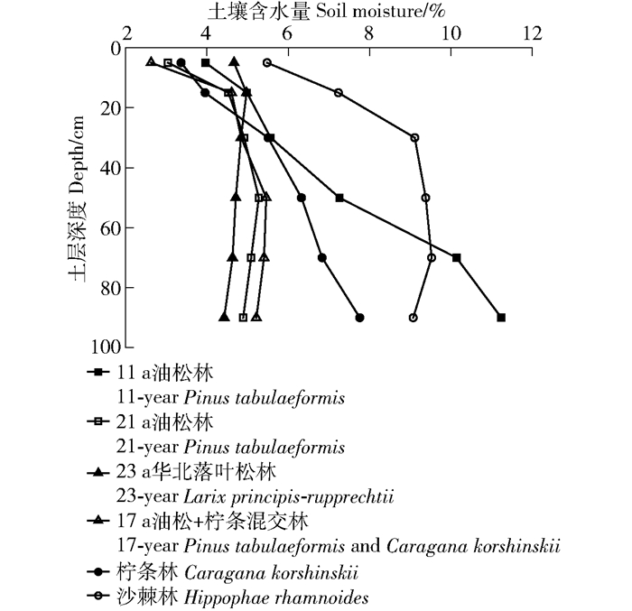 5 结论1) 6种林地0~100 cm深度平均土壤含水量范围在4.62%~8.30%;平均土壤含水量由大到小依次为:沙棘林>11 a油松林>柠条林>17 a油松+柠条混交林>23 a华北落叶松林>21 a油松林;0~20 cm土层土壤含水量相对较低,较深土层土壤水分受植物蒸腾耗水、根系分布深度及密度影响。